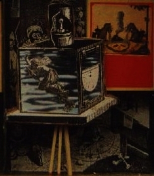 Size:30 cm x 25 cm x 8 cm Materials: wood, iron, plexiglas, papier-mâché, acrylic paint, carton, photocopy, matchboxes and matches