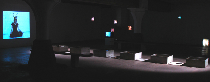 equipment: video projections and monitors, photo light boxes, containers with water, tiles, benches.