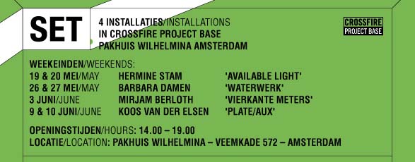 Crossfire Project Base project space is located in the basement of Pakhuis Wilhelmina, in the eastern port area of Amsterdam. It is a beautiful space with beamed ceiling and 2 large pillars to support the building. Four installation artists each worked in this space for a week and showed their installations over 4 consecutive weekends.