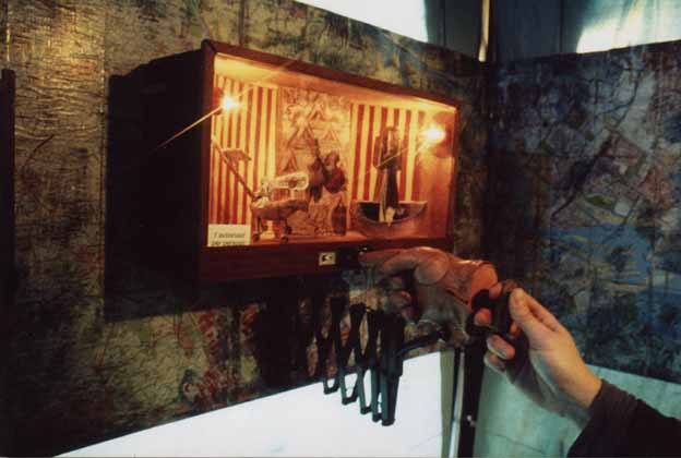 Viewing box with artificial hand. When the hand pushes the button, than spotlights lighten the scene in the box.
