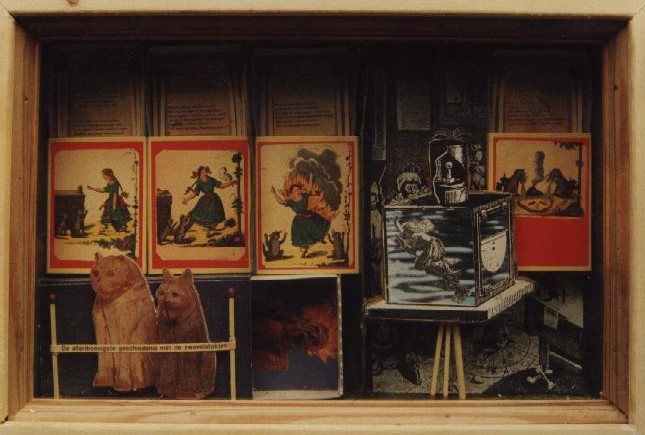 Size:30 cm x 25 cm x 8 cm Materials: wood, iron, plexiglas, papier-mâché, acrylic paint, carton, photocopy, matchboxes and matches